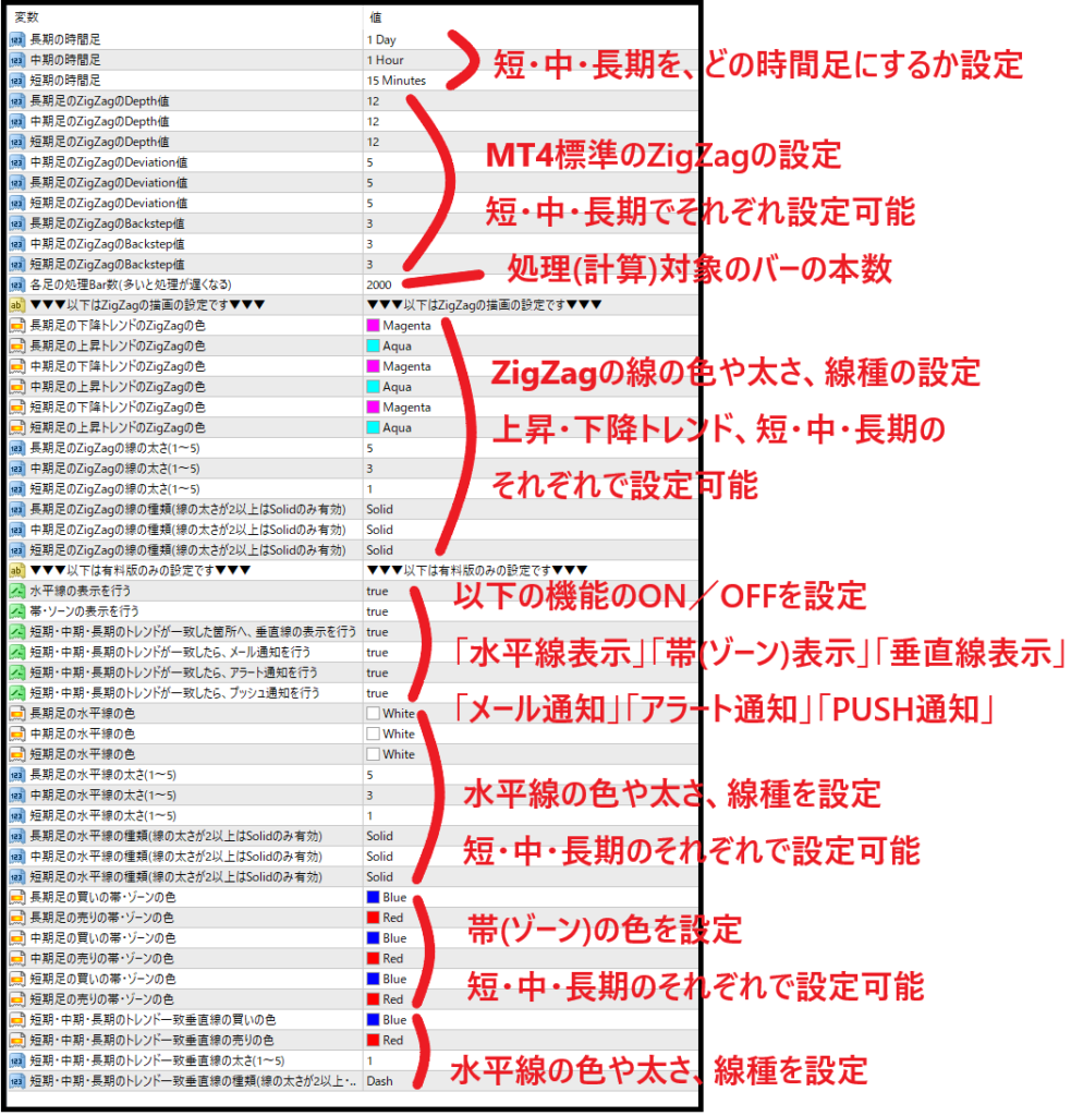 - MT4標準のZigZagの仕様上、過去に遡ってZigZagを引き直すことがある為、過去のトレンドの方向が変わることがあります。