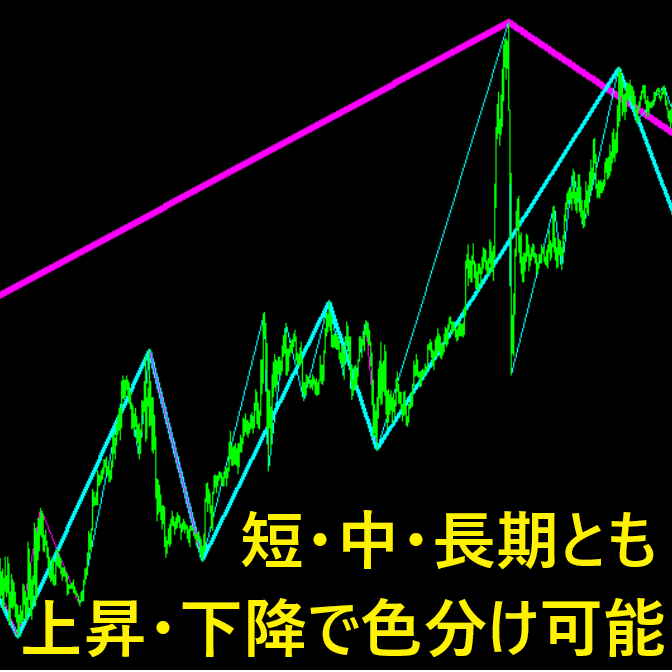 - ZigZagは、方向性が分かりやすいように、上昇トレンドと下降トレンドで色分け