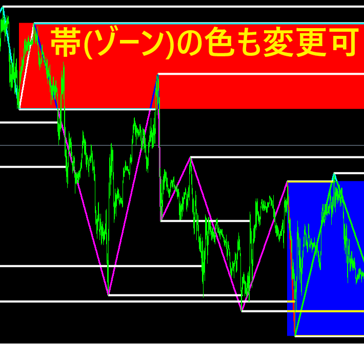 - ゾーントレードにも対応する為、トレンド転換部分に、自動で帯(ゾーン)を描画