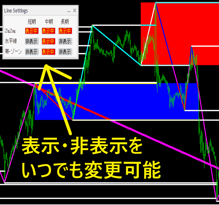 - ZigZag、水平線、帯(ゾーン)は、設定用パネルで、状況に応じて表示・非表示を変更可能