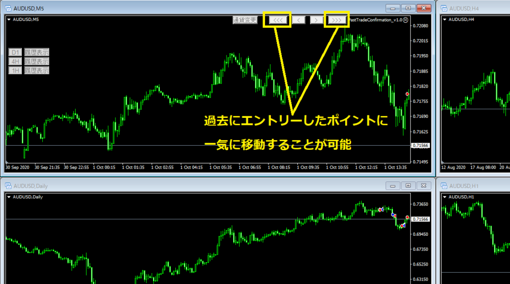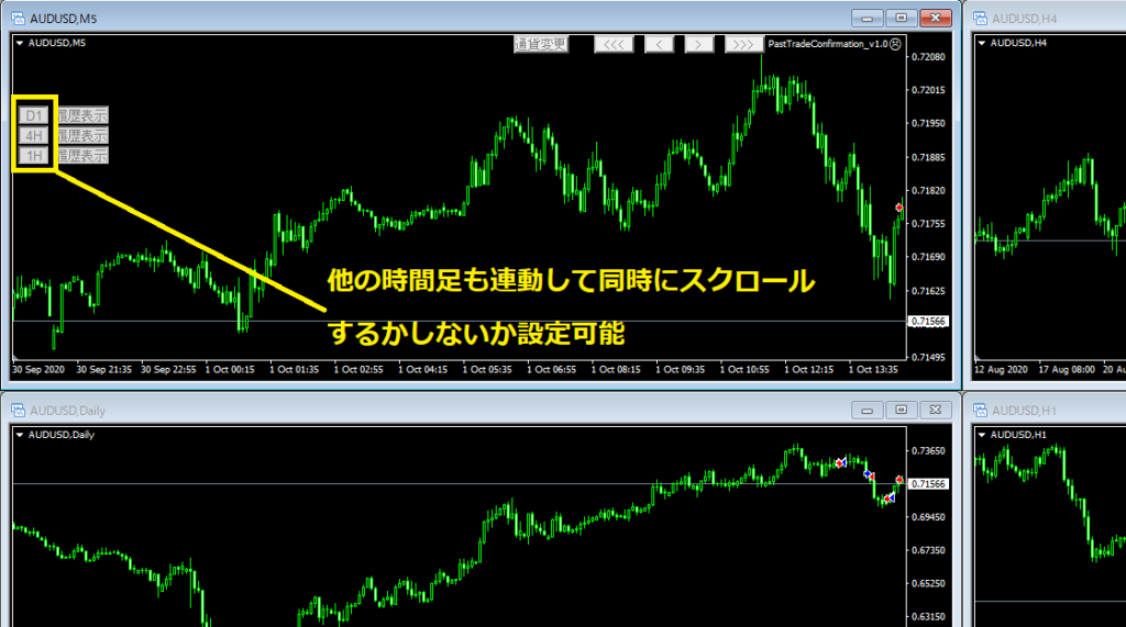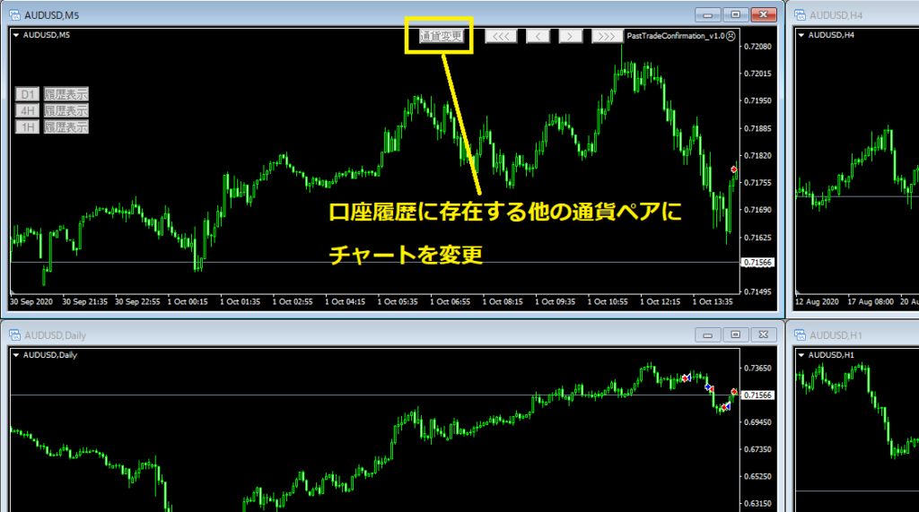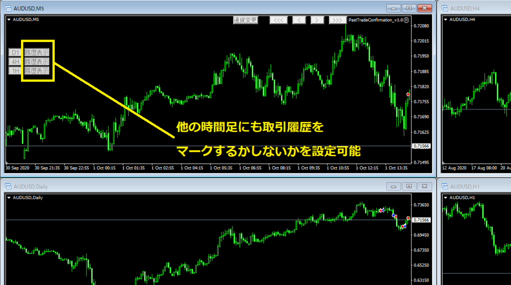 MT4上に同じ通貨で異なる時間足のチャートを表示していた場合、全てのチャートに、エントリー&決済履歴を表示可能。
