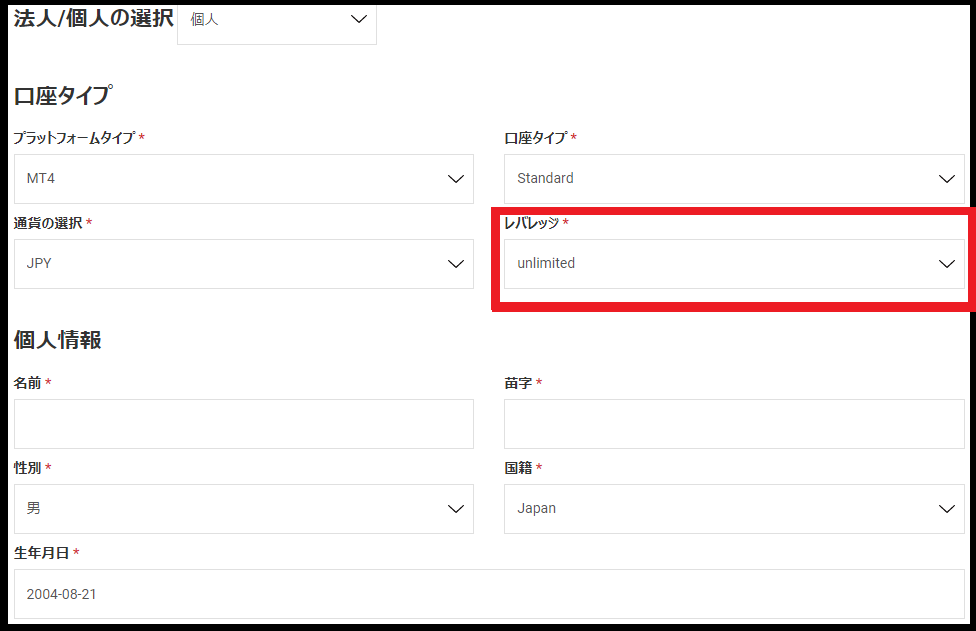 その時に、下の画像の赤枠で囲った「レバレッジ」を「unlimited」に変更して、必要事項を入力。